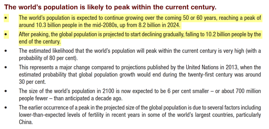 - Which disagrees with the UN projections. UN projections do not currently forecast a near-term cliff by 2100. The UN’s World Population Prospects 2024 projects a peak around the mid-2080s (~10.3b) and then only a modest decline to ~10.2b by 2100. ↩︎